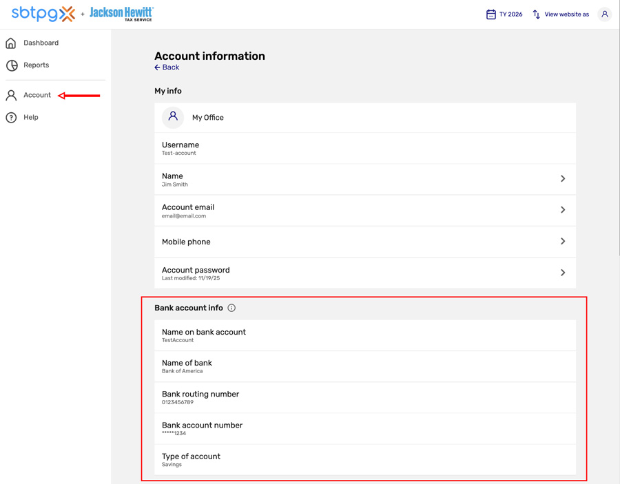 Once your information is updated Jackson Hewitt will retransmit your updated information to us. After that, view the updated information by logging in to our website, select Account and scroll down to the Bank account info section.