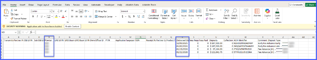 Upon opening the report, columns such as “Disbursed Date,” “Deposits,” “ACH Identifier,” and others will enable you to reconcile (match) entries appearing in our system with those on your bank statement.