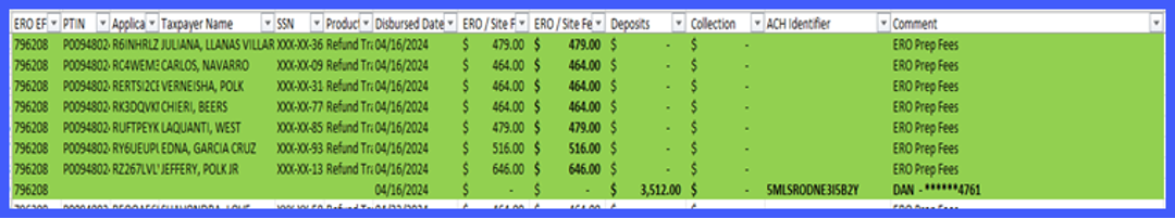 | Example #2 - Multiple Prep Fees on 04/16/2024 | Seven taxpayers each paid a preparation fee on the same day. SBTPG has not yet grouped them into one bank deposit, resulting in a blank “ACH Identifier” until posting. | Filter by Disbursed Date = 04/16/2024. Sum the “ERO / Site Fees Paid” column to get $3,512.00. Upon SBTPG bundling these into one ACH deposit, filter by Disbursed Date = 04/16/2024 and ACH Identifier = 5MLSRODNE3I5B2Y Confirm “Deposits” = $3,512.00 matches your bank statement “Comment” = DAN-4761 |