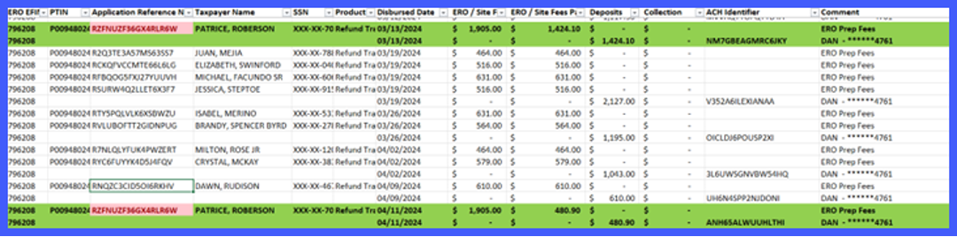 - PCenter and Site-Level Visibility - For individuals managing multiple offices or franchises, filtering by EFIN or business name allows visibility into which location generated each fee or deposit.