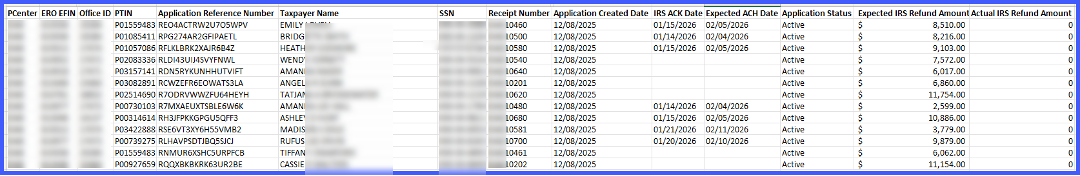 | Emily XXXX (first Row) | The taxpayer's tax refund has an Acknowledgment from the IRS on 01/15/2026 and expected tax refund of $8,510.00 | Find the acknowledgment date in the “IRS ACK Date” column